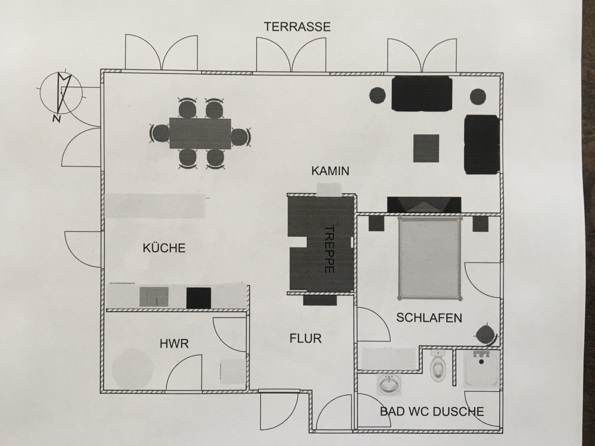 Im Erdgeschoß haben wir auf einige Wände verzichtet. Küche, Ess- und Wohnbereich gehen ineinander über und bilden das großzügige Herzstück des Hauses. Im Erdgeschoss liegen weiterhin ein Schlafzimmer mit Doppelbett (160 x 180 cm) und ein Bad mit Dusche und WC.